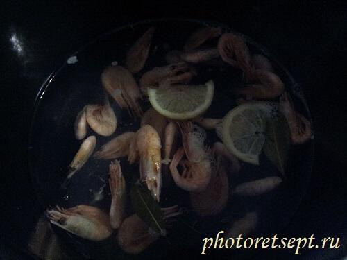 2. Отварите креветки. В кипящую воду добавляем щепотку соли, пару ломтиков лимона (лимонный сок), лавровый лист. Закладываем размороженные креветки и варим 3 минуты. Откидываем на дуршлаг и ждем пока остынут.
