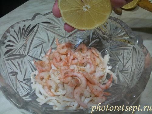 3. Очищаем креветки, сначала отрывая голову, затем снимая остатки панциря с лапками. Отправляем очищенные креветки в чашку с кальмарами. Из лимона выжимаем сок, примерно 1-2 ч.л и перемешиваем.