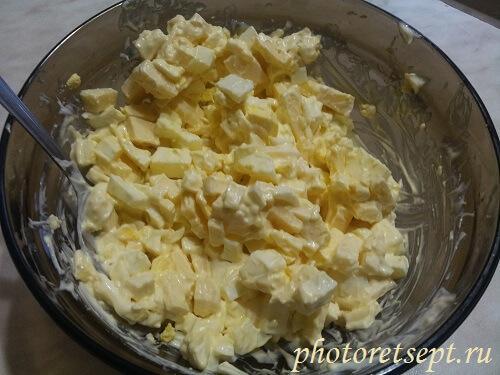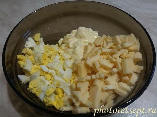 6. Яйца отварить, очистить и нарезать кубиками. Смешать сыр с яйцами и чесночным майонезом.