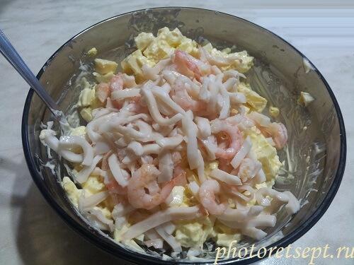 - Берем большое блюдо. Выкладываем слоями: кальмары, картошка, лук, яйцо, креветки, сыр. Сверху промазываем майонезом.