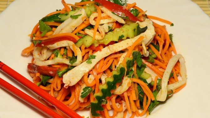 Тушки кальмар опускаем в кипящую соленую воду, спустя 2-3 минуты вынимаем. Очищаем от кожуры и пленки. Вынимаем хребет. Нарезаем соломкой.