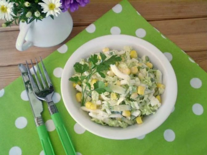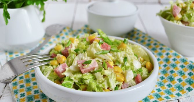 - Лук мелко рубят и присыпают им готовый кулинарный шедевр. Салат пекинская капуста, курица, кукуруза готов!