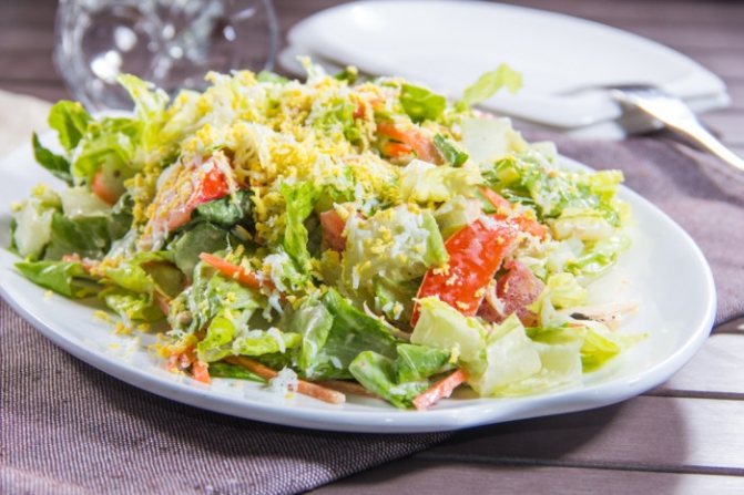 - Обрабатываем кочан, удаляем жесткие части, разделяем листья на узкие полоски. Отправляем их к яйцам и кусочкам морепродуктов.