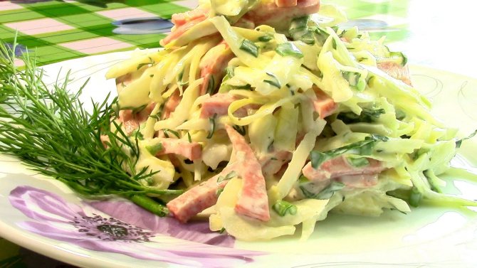 Капусту нарезаем на небольшие кусочки. Колбасу нарезаем брусочками. Все ингредиенты смешаем и заправим майонезом.