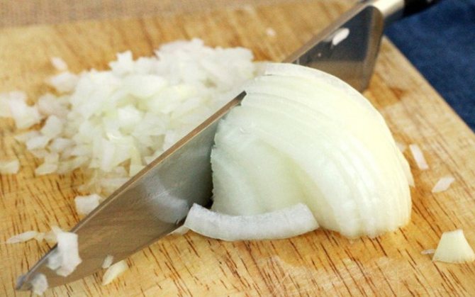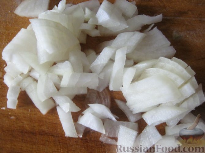 Лук репчатый очистить, помыть и нарезать на кубики. Или очистить и натереть на терку чеснок.