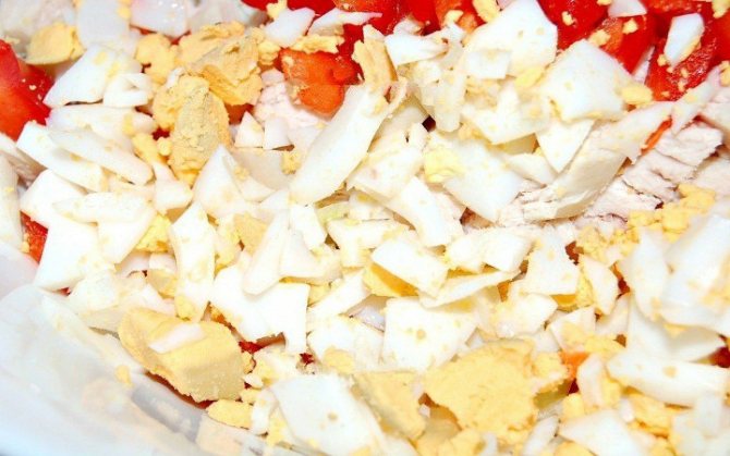 Салат «красная Шапочка» получил свое название из-за того, что его верх всегда состоит из ингредиентов красного цвета. Можно для этого использовать болгарский перец, но мне больше нравится салат «Красная Шапочка» с помидорами. Остальные ингредиенты тоже отличаются вразных рецептах, в том, что я сегодня покажу вам, я использовала отварную куриную грудку, сыр, яйца и грибы. Салат «Красная шапочка», рецепт с фото пошагово с помидорами которого я описала для вас ниже, можно подавать как порционно, так и в большом прозрачном салатнике, чтобы видны были слои.