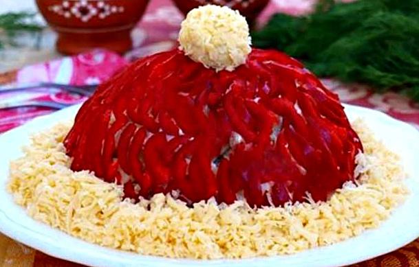 Довольно часто именно этот вариант салата «Красная шапочка» выполняется в виде шапки Деда Мороза. Смотрится на столе довольно эффектно, а съедается быстрее всех других блюд!