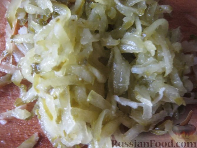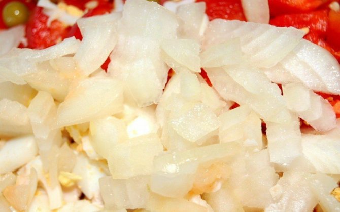 Репчатую луковицу чищу, шинкую кубиками и заливаю кипятком на пару минут. Воду сливаю и кубики лука можно использовать для салата, лук уже не будет слишком горьким.