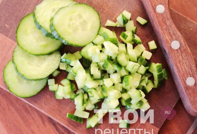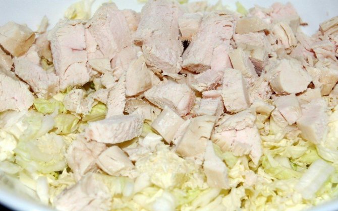 Куриное филе в салате должно быть сваренным, чуть присоленным и охлажденным. Нарезаю его по мере возможности небольшими квадратиками.