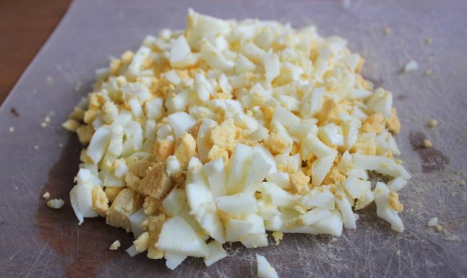 Сырые куриные яйца моем, кладем в небольшую кастрюльку и заливаем холодной водой так, чтобы они были покрыты на 2-3 пальца. Добавляем в воду с 0,5 чайной ложки соли и ставим на огонь. На большом огне доводим до кипения, затем огонь уменьшаем и варим яйца при умеренном кипении в течение 10 минут. После варки яйца сразу опускаем в емкость с холодной водой и полностью охлаждаем. Отваренные остывшие яйца очищаем от скорлупы. При необходимости – если на поверхности остались осколки шелухи — снова промываем, и обсушиваем бумажными полотенцами. После этого нарезаем яйца мелкими кубиками либо натираем на крупной терке.