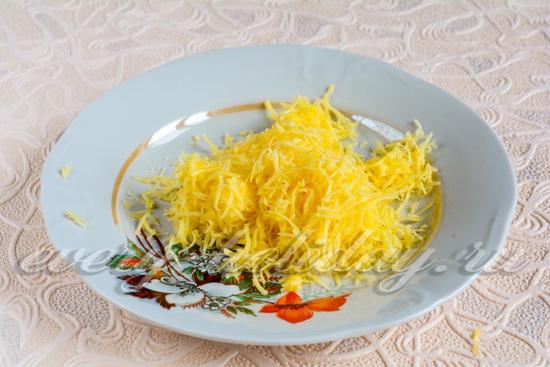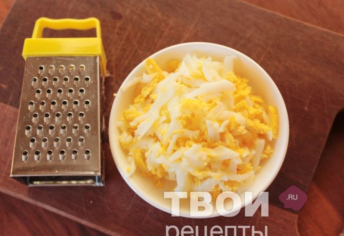 Яйца отварить в течение 3-х минут в кипятке, оставить на пару минут, затем резко поместить в холодную воду — остудить, очистить и натереть на средней тёрке.