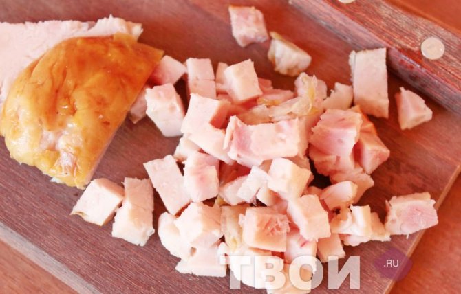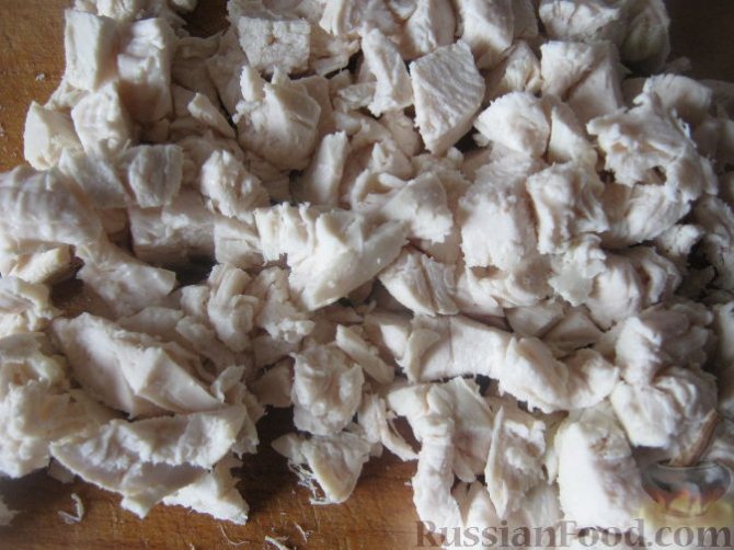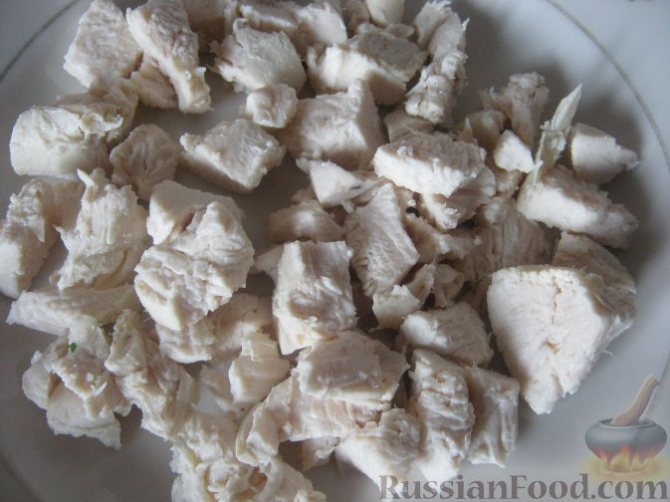 Куриную грудинку (окорочок) отварить до готовности. Охладить. Отобрать от косточек и нарезать на кусочки.