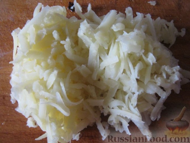 Картофель помыть, залить холодной водой. Отварить до готовности в мундире. Охладить. Очистить. Натереть на крупной терке.