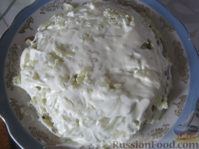 Продукты для салата «Красная шапочка» выкладывать слоями, смазывая майонезом по вкусу.