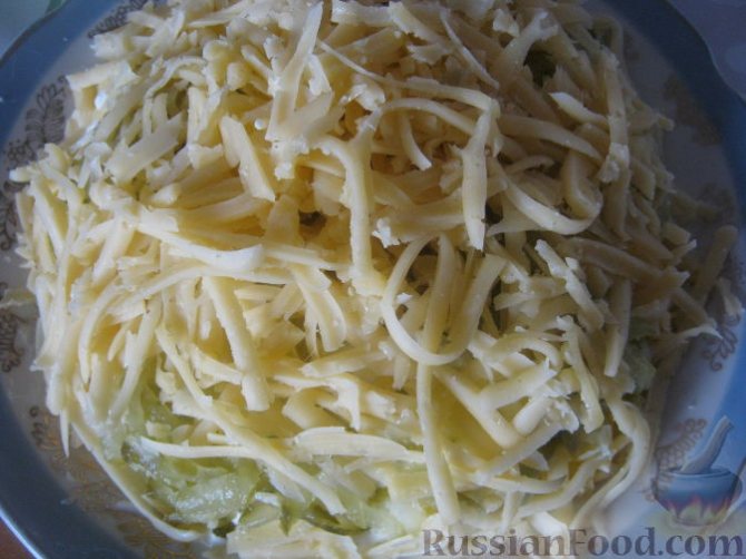 Сыр натираю на мелкой терочке, и обсыпаю им края салата, чтобы начала формироваться красивая шапочка.
