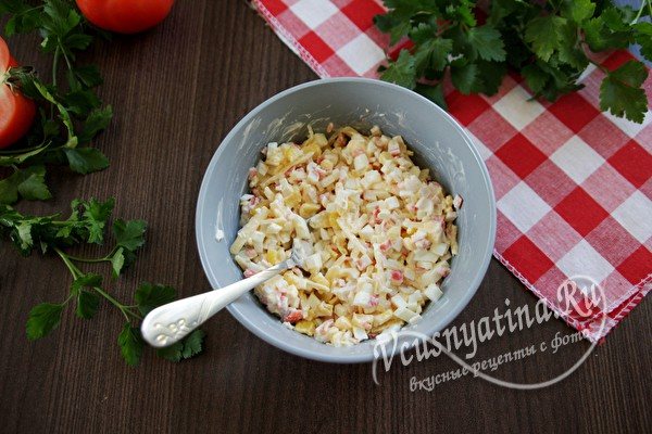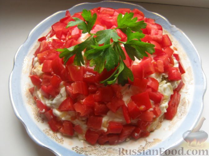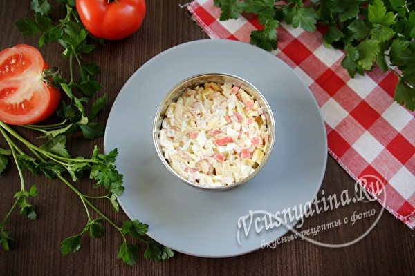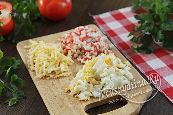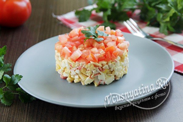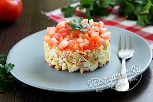 Салат «Красная шапочка» с крабовыми палочками и помидорами