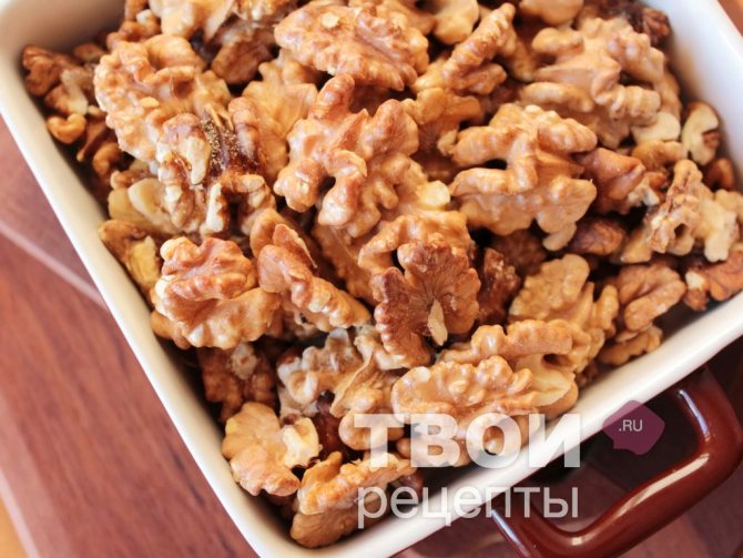 Ядра грецкого ореха поджарить в духовке, измельчить ножом.