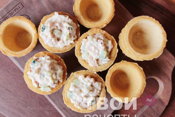 Фуршетный вариант — подача в тарталетках не только очень удобна, но еще и эффектна.