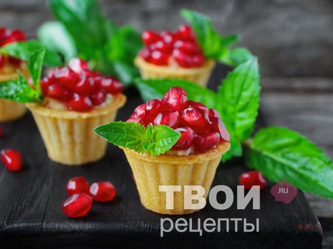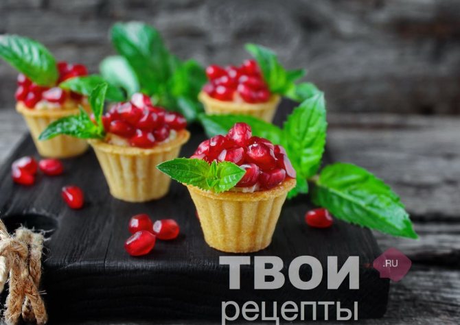 Из зёрен граната на каждой тарталетке оформить «красную шапочку», украсить свежей зеленью и до подачи держать в холодильнике.