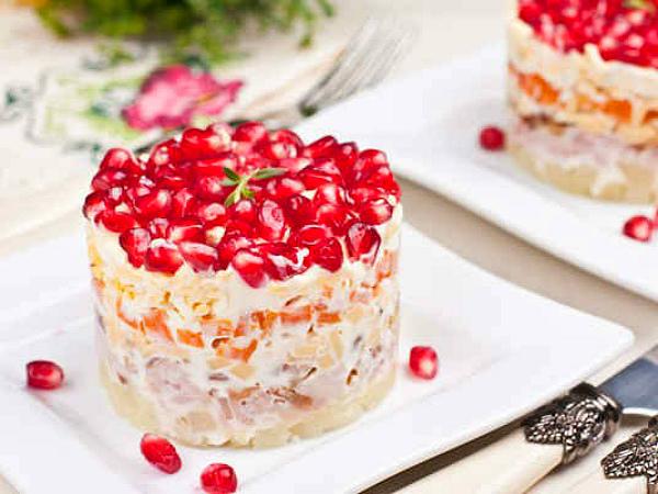 Это пикантное блюдо украшает гранат, который употребляют в роли «шапочки». Такой салат готовится в праздничный или обычный день. Он прекрасно сочетается со всеми видами закусок.