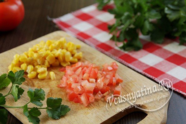 Кукурузу достаем из банки и откидываем на дуршлаг. Помидоры промываем и обсушиваем. Разрезаем помидоры на 4 части и удаляем жидкую часть с семенами. Оставшуюся плотную мякоть нарезаем мелкими кубиками, примерно 3-5 мм.