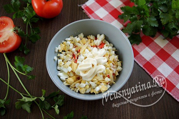 Как и положено в салат кладу майонез, чтобы салат стал единым целым.