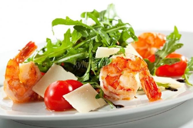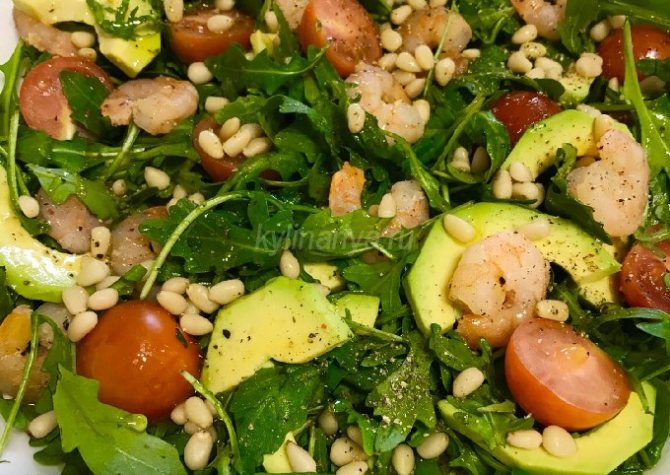 - Руккола с тигровыми креветками и авокадо