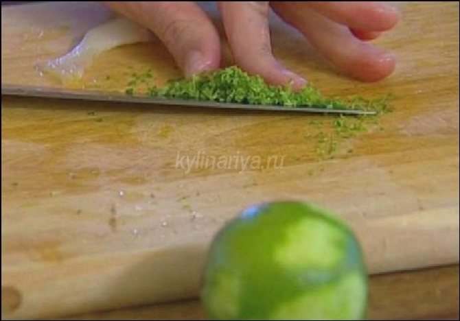 - Лайм разрезаем на половину. С одной части удаляем кожуру и выдавливаем из нее сок. Цедру лайма мелко нарезаем.