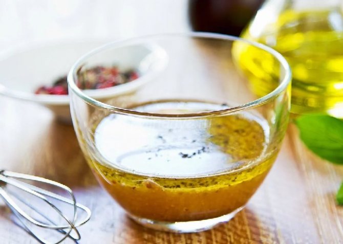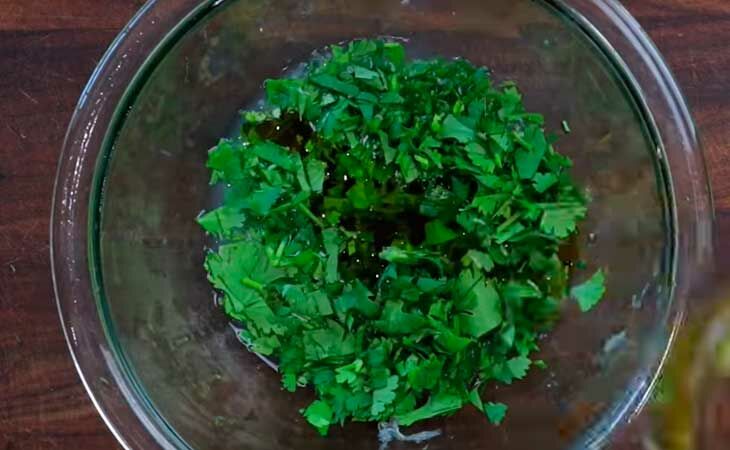 Осталось дело за заправкой. И в этот раз мы делаем все как обычно — оливкое масло смешиваем с зеленью, соком лимона и приправами.