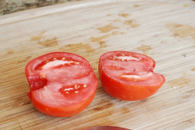- Помидоры разрезаем на 2 половинки.