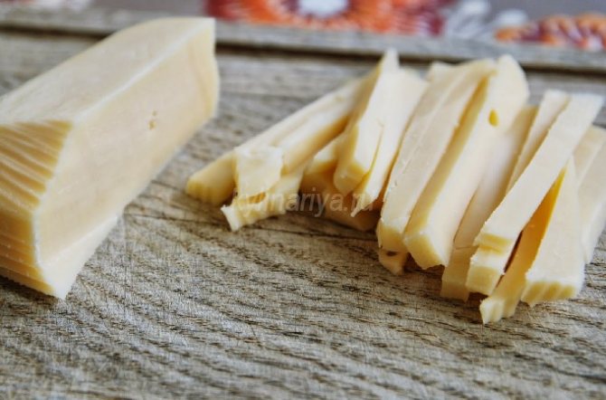 - Сыр аккуратно режем тонкими полосками.