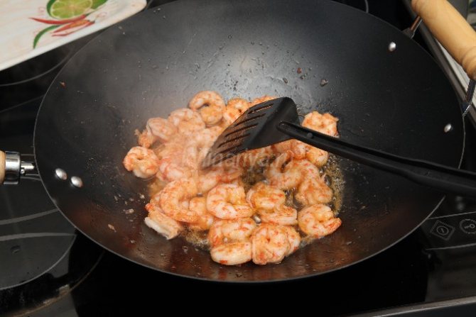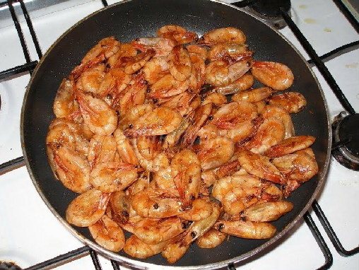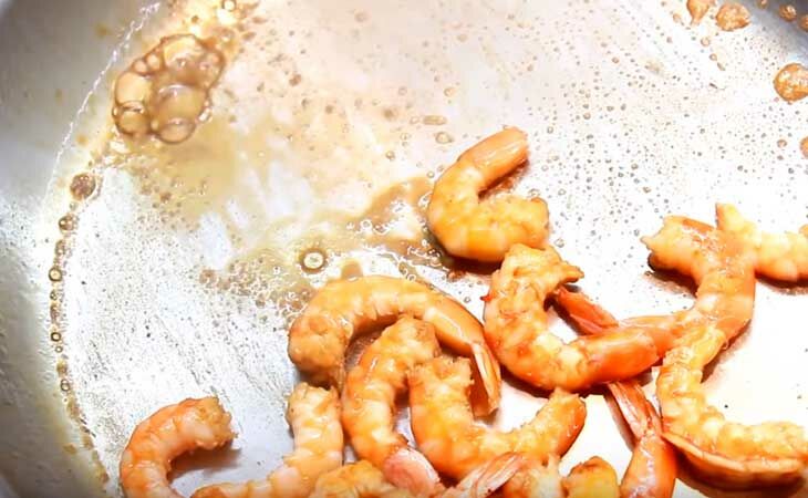 - Креветки очищаем от панциря, отрезаем им голову. Бросаем их на горячее растительное масло и жарим 4-5 мин. Охлаждаем.