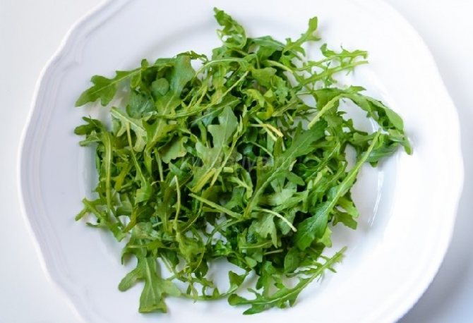 - Собираем салат. Сразу на тарелку выкладываем рукколу.