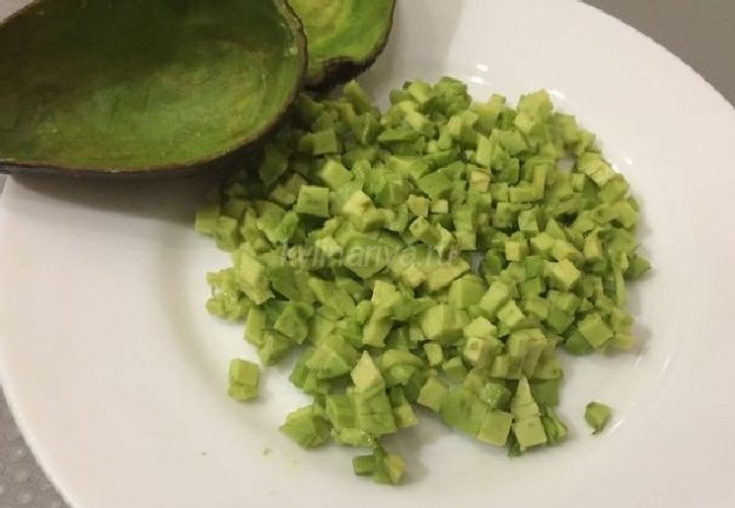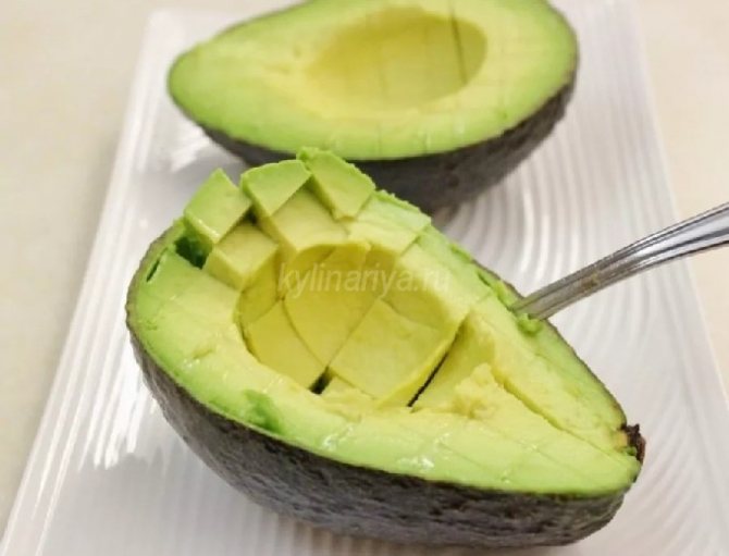 - Авокадо разрезаем на 2 половинки и достаем косточку. Разрезаем дольки авокадо на довольно крупные квадратики.