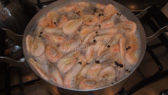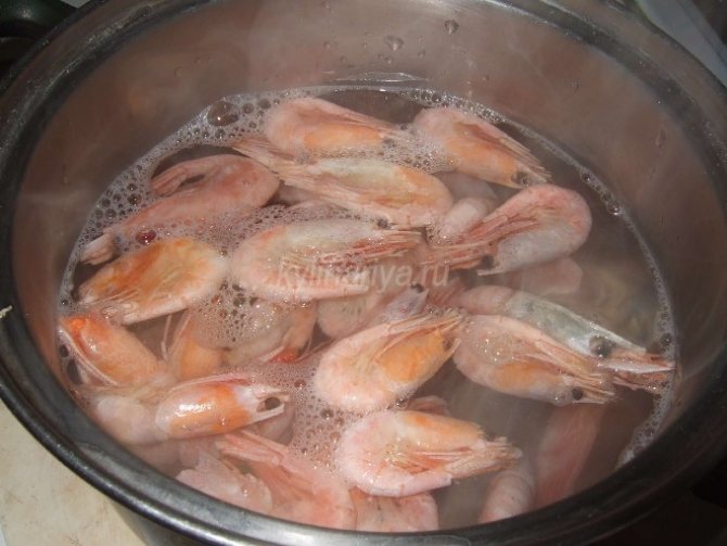 - Кипятим воду и варим в ней креветки и кальмары 4-5 мин.