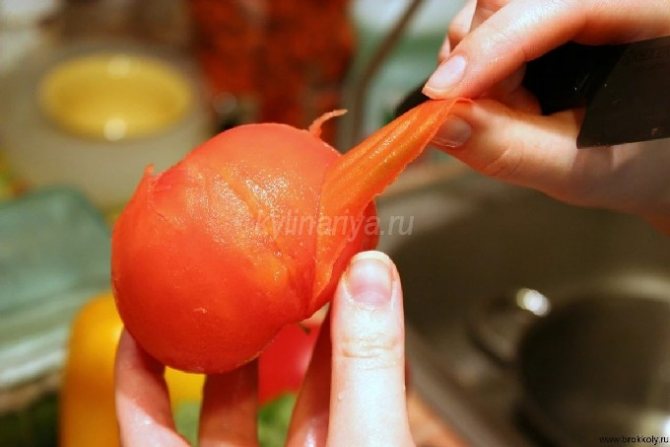 - Помидоры погружаем в кипяток на 2 мин. Теперь удаляем с них кожицу и нарезаем на кусочки. Добавляем их в салат.