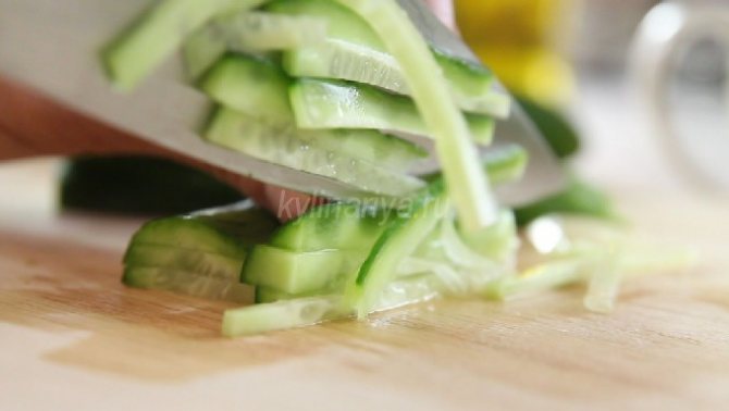 - Овощи промоем. Разрезаем огурец на прямоугольные полоски небольшой толщины.