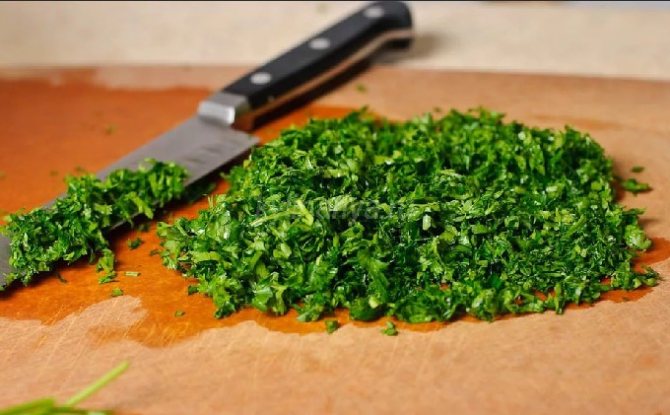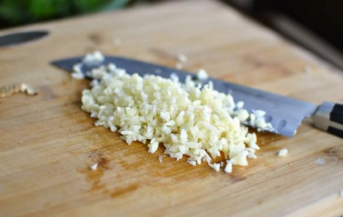 - Мелко измельчаем чеснок ножом.