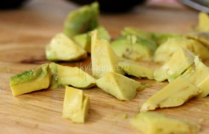 - Теперь очищаем от кожуры авокадо. Сразу разрезаем на 2 части, удаляем косточку, а затем нарезаем на небольшие дольки.
