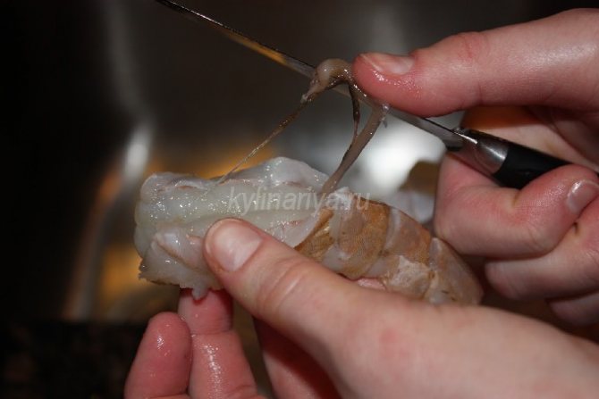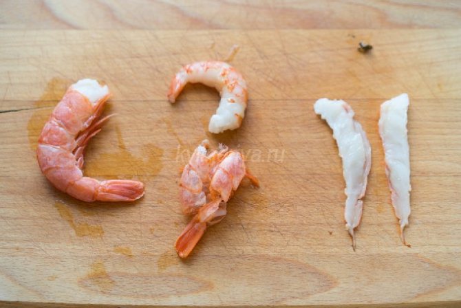 - Чистим креветки от панцирей, удаляем темную вену и нарезаем полосками.