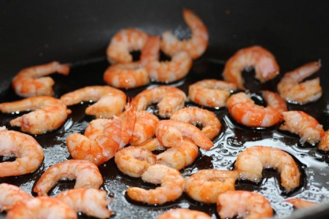 - Креветки обжариваем на растительном или оливковом масле, 2-3 мин., не забывая их переворачивать.