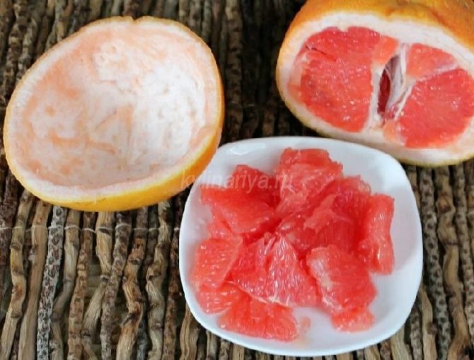 - Грейпфрут очищаем от кожуры. Разрезаем на дольки, а их еще на несколько кусочков. Вытекший сок можно использовать для заправки.