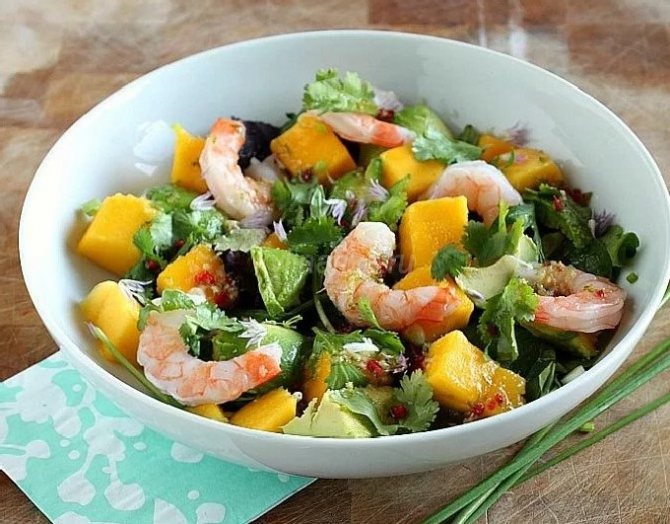 Легкий и аппетитный салат из манго, авокадо, креветок