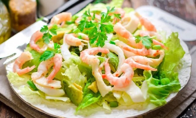 Как вкусно приготовить салат из креветок, кальмаров, авокадо?