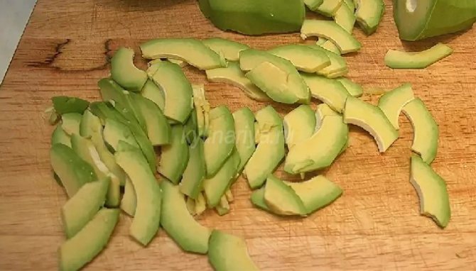 Нарезаем авокадо тонкими дольками — четвертинками.