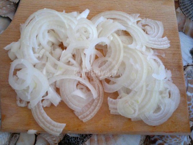 - Лук очищаем от шелухи и нарезаем полукольцами.