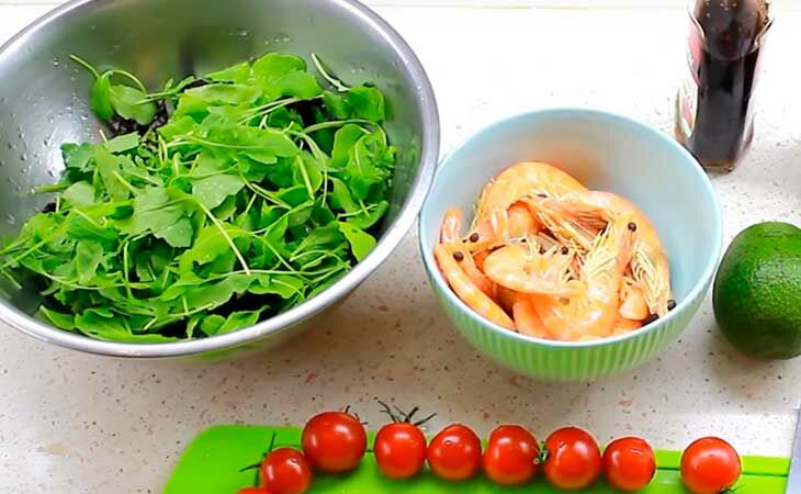 Салат с креветками, авокадо, помидорами черри и рукколой