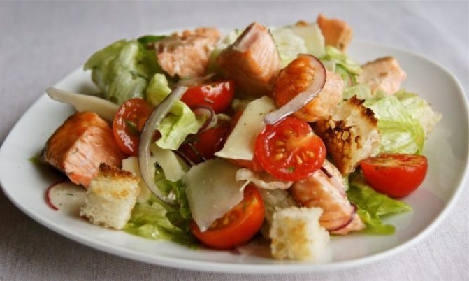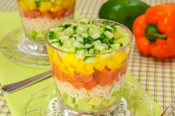 Ароматные и хрустящие овощи в комбинации с красной рыбкой добавят салату пикантность.