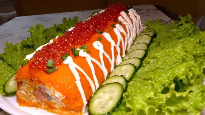Далее полученная масса формируется в форму овала — тело будущей рыбки. Крабовые палочки надрезаются длинными дольками. Далее их необходимо выложить поверх салата, имитируя чешую рыбы. Глаза легче всего выложить оливками или маслинами. Хвост и плавники формируем листьями салата. Блюдо можно подавать на стол!