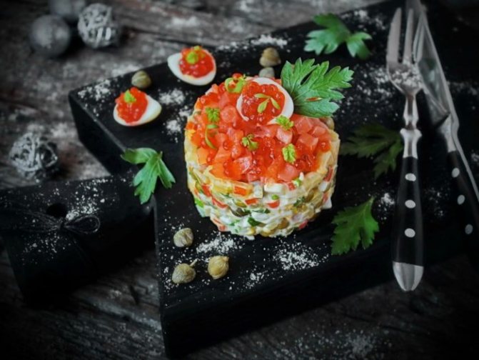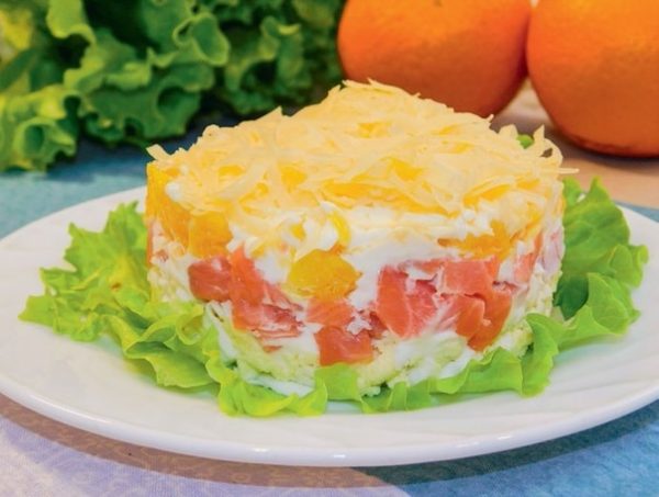 Это вкусный нежный салат из семги, который выкладывается слоями. Традиционная подача в сочетании с пикантным вкусом понравится гостям. Закуска станет украшением праздничного стола.